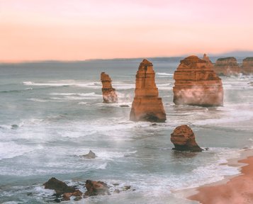 Die spektakuläre Great Ocean Road schlängelt sich entlang der Klippen des wilden und windgepeitschten Southern Ocean. Es sind beeindruckende Aussichten entlang der legendären Straße, mit ihren zerklüfteten Klippen, leeren Stränden und Steilküsten, die von leuchtend grüner Landschaft umgeben sind.
